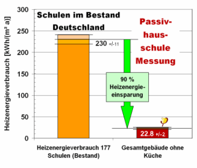 Der Heizenergieverbrauch in der Statistik von 177 bestehenden Schulen streut ziemlich stark mit einem Mittelwert von über 200 kWh/(m²a). Im Vergleich dazu liegt der gemessene Heizenergieverbrauch der Passivhaus-Schulen auf dem Riedberg/Frankfurt unter 23 kWh/(m²a) - eine gewaltige Einsparung von über 90 % beim Energieverbrauch, bei den Heizkosten und bei der Umweltbelastung. Auch in Bezug auf den gesamten Primärenergieverbrauch wird eine hohe Einsparung von mehr als 2/3 erreicht - und zwar selbst gegenüber Schul-Neubauten, welche die Energieeinsparverordnung (EnEV) erfüllen ([Peper 2007] ).