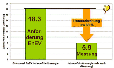 Damit sind die Anforderung an den Passivhausstandard mehr als erfüllt (Primärenergie max. 120 kWh/(m²a)).