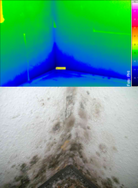 - Veränderte, meist verringerte innere Oberflächentemperaturen; das kann im schlimmsten Fall zum Durchfeuchten von Bauteilen und Schimmelwachstum führen (das sind die wirklich schädlichen, die 'bösen' Wärmebrücken).