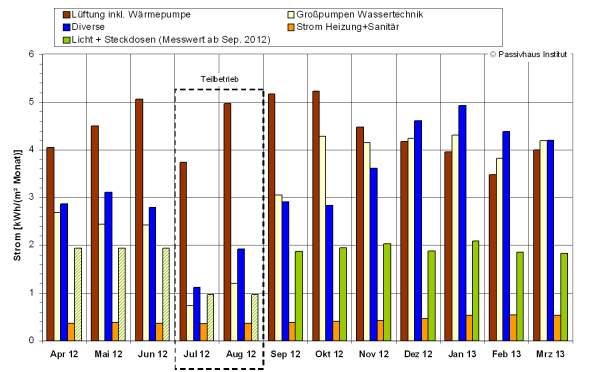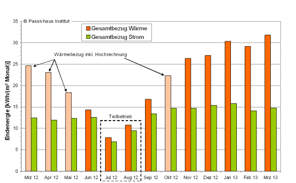 Wird der Verbrauch der dargestellten Monate auf ein Gesamtjahr umgerechnet, ergeben sich 258 kWh/(m²a) für den gesamten Wärmebezug und 156 kWh/(m²a) für den gesamten Strombezug des Gebäudes.