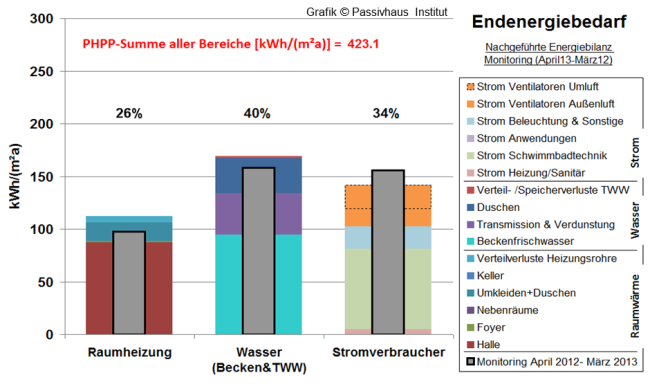 Der gesamte Heizenergieverbrauch des Bades setzt sich zusammen aus den drei Bereichen Beckenwassererwärmung, Warmwasserbereitung Duschen und Nachheizung Lüftung. Die Beckenwassererwärmung benötigt insgesamt 123 kWh/(m²a) (Energiebezugsfläche), die Erwärmung des Duschwassers 35 kWh/(m²a). Für die Beheizung (Luftheizregister) des Gebäudes wurden 94 kWh/(m²a) verbraucht.