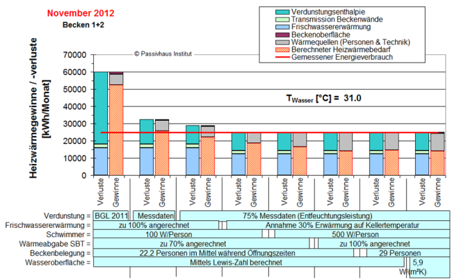 Die Möglichkeit, bereits während der Planungsphase den Energiebedarf eines Gebäudes verlässlich voraussagen zu können, ist eine grundlegende Voraussetzung, um hohe Energieeffizienz erreichen zu können. Sie ermöglicht die Optimierung einzelner Komponenten sowie des ganzheitlichen Gebäudekonzeptes. Die Energieströme in einem Hallenbad sind aufgrund vieler Wechselwirkungen und Regelungen sehr komplex und daher nur schwer erfassbar. Aus diesem Grund wurde das oben erwähnte Mehrzonen-PHPP entwickelt. Das Tool wurde während der Planungsphase des Bades für die entstehenden Anforderungen angepasst und befindet sich auch weiterhin in der Entwicklung.