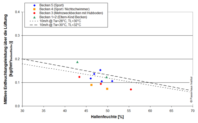 Die Analyse zeigt außerdem, dass der Umluftvolumenstrom in Summe aller Geräte des Hallenbades im Mittel etwa 70 % beträgt, der Außenluftvolumenstrom dagegen nur 30 %. Nur Letzterer ist für die Entfeuchtung der Hallen und für die Einhaltung der Luftqualität (Abtransport von Schadstoffen) notwendig. Der Umluftvolumenstrom dagegen ist nur vorgesehen, um eine gute Durchmischung der Hallenluft sicherzustellen, wozu auch geringere Umluftvolumenströme ausreichen würden. Dies haben die durchgeführten Versuche zur Hallendurchströmung gezeigt (Nebelversuche). Ziel des Passivhaus-Konzeptes für Hallenbäder ist letztlich eine Betriebsweise vollständig ohne Umluftanteil, da dies eine erhebliche Reduktion des Stromverbrauchs der Lüftungsgeräte mit sich bringt.