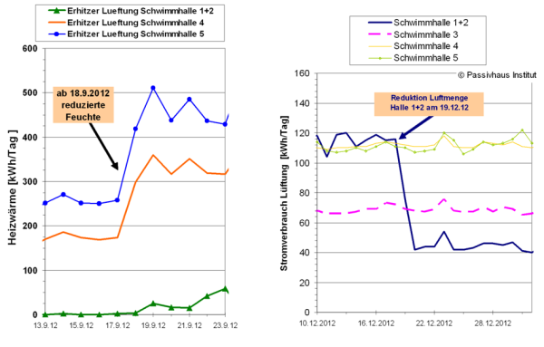 Die Regelung der Lüftungsgeräte erfolgt nach dem Sollwert der Raumluftfeuchte, niedrigere Feuchten erfordern höhere Außenluftwechsel zur Trocknung der Luft, was einen höheren Wärmeverbrauch erzeugt. Im Laufe des Betriebs wurden aus unterschiedlichen Gründen die Sollwerte der Hallenfeuchte verändert. Am 18.9.12 wurden die Hallenfeuchten in drei Hallen deutlich gesenkt (ca. -15 %-Punkte bzw. 4,4 g/kg), was zu einer erheblichen Erhöhung des Wärmeverbrauchs geführt hat (Summe der drei Hallen ca. +410 kWh/Tag) (siehe Abb. 5, links). Dabei wurde in Halle 1+2 vorher gar nicht über das Heizregister nacherwärmt, da die Wärmepumpe des Gerätes zur Beheizung ausreichte (Abbildung 5). Der Stromverbrauch der drei Lüftungsgeräte hat sich dadurch zusätzlich um fast 100 kWh/Tag erhöht. Damit wird der Einfluss der Hallenfeuchte auf den Energieverbrauch deutlich.