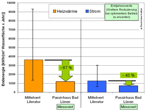 Bereits diese erste Orientierung zeigt deutlich, dass die Verbrauchswerte in Lünen bereits im ersten Betriebsjahr deutlich unter den Mittelwerten der Literatur liegen: Im Wärmebereich liegt der Messwert fast 70 % unter dem Literaturmittelwert, beim Strom sind es mehr als 40 %.