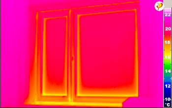 | Innenthermographie eines Passivhausfensters: Die ungestörten Oberflächen von Verglasung und Rahmen sind gleichmäßig warm (18 bis 19°C in diesem Bild). Jedoch ist entlang des gesamten Glasrandes sehr gut ein Temperaturrückgang erkennbar (gelb, ca. 16,5 bis 17°C). Die Temperaturen sind zwar immer noch hoch genug, um Tauwasser sicher auszuschließen. Aber die Wärmeverluste sind in diesem Bereich messbar erhöht - daher muss der Wärmebrückenverlust des Glasrandes berücksichtigt werden. Bei Passivhausfenstern werden besondere Maßnahmen getroffen, um diese Verluste gering zu halten. Zum Beispiel besser dämmende Abstandshalter („warm edge“) aus Edelstahl oder Kunststoff. Auch die etwas niedrigeren Temperaturen an der Einbaukante des Fensters zur Wand hin sind gut zu erkennen. Bei Fenstern älterer Bauart sind alle diese Temperaturen viel geringer - oft sind sie dann so gering, dass messbar höhere Feuchtigkeiten vorliegen. (Randbedingungen der Aufnahme: Raumtemperatur 22 °C, Außenlufttemperatur 2,5 °C; Passivhausfenster beim Sanierungsprojekt „Jean Paul Platz“ in Nürnberg; hier mehr Informationen zu diesem Projekt). |