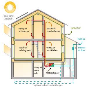 Gesundheit und Komfort sind die wichtigsten Elemente beim Passivhausdesign, eine hervorragende Raumluftqualität ist unverzichtbar. Dies kann jedoch nur erreicht werden, wenn verbrauchte Luft in regelmäßigen Abständen durch frische Außenluft ausgetauscht wird. Dies kann definitiv nicht durch zweimal tägliches Öffnen der Fenster erreicht werden. Eine Belüftung funktioniert nur dann einwandfrei, wenn verbrauchte Luft ständig aus der Küche, den Badezimmern und allen anderen Räumen mit Luftverschmutzung entfernt wird. Frische Luft muss in das Wohnzimmer, das Kinderzimmer, die Schlafzimmer und die Arbeitszimmer geleitet werden, um die entfernte Luft zu ersetzen. Das System liefert genau so viel Frischluft, wie für Komfort und gute Raumluftqualität erforderlich ist; es wird nur Außenluft zugeführt – keine Umluft. Dies führt zu einer hohen Raumluftqualität. Mehr zur Lesen: