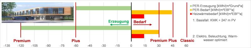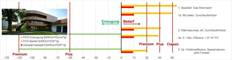 Um die für das Passivhaus Premium erzeugungsseitig benötigten 120 kWh/(m²a) erneuerbarer Primärenergie zu erreichen, werden 157 m² PV-Anlage, entsprechend 63 % der Dachfläche installiert. Die Reduktion des Energiebedarfes auf 30 kWh/(m²a) erneuerbare Primärenergie fällt schwerer. Bei dem gewählten Heizsystem schlägt sich jede Kilowattstunde eingesparter Heizenergie nur in durch die Wärmepumpenarbeitszahl reduzierter Größe nieder. Der erste Ansatz gilt daher wieder der Beleuchtung. Das komplette Gebäude wird auf LED-Beleuchtung höchster Effizienz umgestellt und die Elektroeffizienz im Allgemeinen stark erhöht. Mangels Anwendung bringt hier eine Duschwasser-Wärmerückgewinnung keinen Effizienzgewinn. Wohl aber die Verwendung von Spararmaturen. So lässt sich gut eine Kilowattstunde PER einsparen. Zusammen mit Fenstern der Effizienzklasse phA wird das Ziel Passivhaus Premium erreicht.