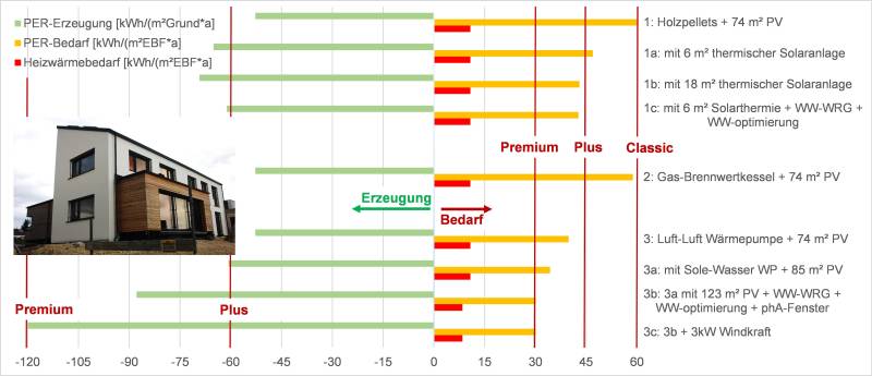 Im Ausgangsfall wird das Einfamilienhaus mit Büroraum durch einem Holzpellettkessel beheizt. Auf dem Dach ist eine Photovoltaik(PV)-Anlage mit 74 m² installiert (Variante 1). Schon in diesem Ausgangsfall ist das Gebäude mit einem Jahresheizwärmebedarf von 11 kWh/(m²EBF*a) sehr energieeffizient und sorgfältig ausgeführt, was sich z.B. in einem Luftdichtheitswert von 0,14 h-1 niederschlägt. Mit einem PER-Bedarf von 60 kWh/(m²EBF*a) erreicht es gerade die Kriterien des Passivhaus Classic, die PER-Erzeugung liegt mit 53 kWh/(m²Grund*a) unter dem Schwellenwert für das Passivhaus Plus (60 kWh/(m²Grund*a)).