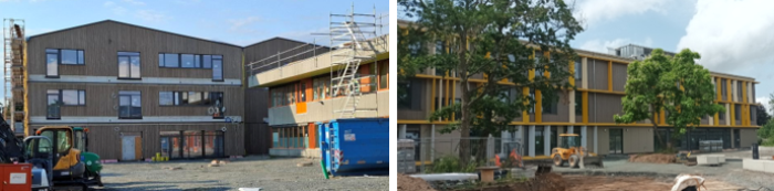 - Der für Schulbauten typische große Fensteranteil an einer Fassadenseite erfordert massive Stützen in den verbleibenden Wandbereichen. Daher Traghölzer bei Holzleichtbauten soweit es geht nach innen legen und überdämmen.