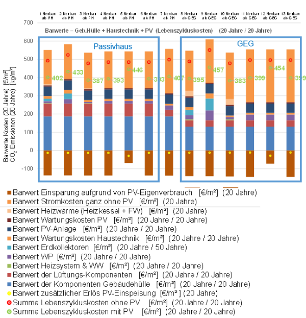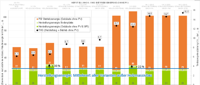 Beim Vergleich der Passivhaus- und GEG-Varianten zeigt sich, dass durch die fast identischen Herstellungsenergien der Aufbauten der deutliche Unterschied im Gesamtenergiebedarf nahezu ausschließlich durch die geringere Betriebsenergie hervorgeht, sodass die Passivhaus-Varianten im Vergleich zu den GEG-Varianten fast nur die Hälfte der Gesamtenergie benötigen. Der zusätzliche Materialeinsatz für einen Passivhaus-Aufbau wirkt sich energetisch nur minimal auf die Herstellungsenergie aus.