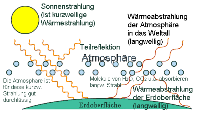 Vereinfachtes Schema zur Wirkung der Treibhausgase: Die durch die Sonne erwärmte Erdoberfläche strahlt als Temperaturstrahler im langwelligen (infraroten) Bereich. Diese Strahlung wird durch die Treibhausgase großteils absorbiert, dann aber wieder in alle Richtungen abgestrahlt. Teils zurück zur Erdoberfläche (Gegenstrahlung), teils in das sehr kalte Weltall. Steigt die Konzentration der Treibhausgase, so findet immer weniger Wärmestrahlung den direkten Weg.