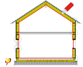 - Für jedes Außenbauteil muss festgelegt werden, welche Bauteilschicht die Luftdichtung übernimmt (z.B. die luftdicht qualifizierte OSB-Platte oder Folie bei einer Dachkonstruktion, der Innenputz bei einer gemauerten Wand, die Betondecke zwischen Keller und Erdgeschoss,…). Die Lage dieser luftdichtenden Ebene wird als rote Linie im Schnitt bzw. im Grundriss eingezeichnet. Das beheizte Volumen muss vollständig von luftdichtenden Ebenen eingeschlossen sein.
