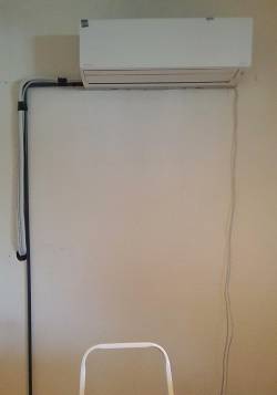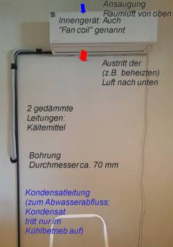 - Für diesen Raum wird durch die Außenwand ein solches Klima-Splitgerät installiert. „Split“ heißt das, weil es aus zwei Geräteteilen besteht: Ein Außenteil, der im Heizfall der Außenluft Wärme entnimmt und die auf ein Arbeitsgas überträgt. Das wird komprimiert und über eine Leitung durch eine Bohrung in der Wand zum Innengerät übertragen. Dort wird die Wärme mittels Ventilator an die Raumluft abgegeben. Die Montage muss wegen des Arbeitsgases3) (s. dazu unten) durch einen spezialisierten Handwerksbetrieb geschehen. Am besten wird ein Splitgerät ausgewählt, das auch bei niedrigen Außentemperaturen noch gut funktioniert (oft als „cold climate“ bezeichnet).